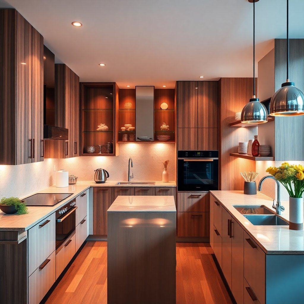 3. **Материалы и отделка:** Использование нержавеющей стали, закаленного стекла или камня позволяет не только стильно дополнить пространство, но и облегчить уборку.